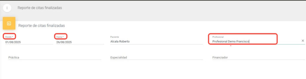 2. Completa los campos obligatorios de rango de fechas “Desde/Hasta”. Si lo deseas, utiliza el resto de los campos que son “Paciente, Profesional, Práctica, Especialidad, Financiador” para realizar una búsqueda específica”.