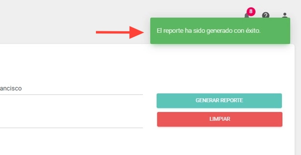 4. Arriba a la derecha visualizarás la notificación que confirma que tu reporte ha sido generado con éxito.
