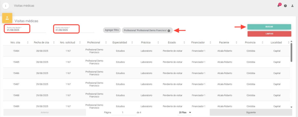 2. En Visitas médicas, completa los campos obligatorios marcados con un asterisco (*). Si lo deseas, agrega filtros adicionales y presiona Buscar.