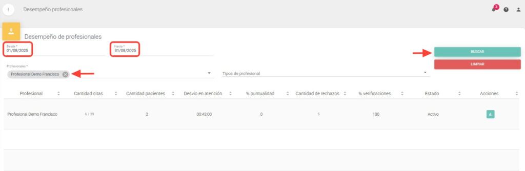 4. En Desempeño de profesional, completa los campos obligatorios marcados con un asterisco (*) y presiona Buscar.